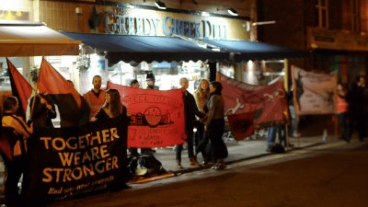 IWW protestiert erfolgreich gegen Restaurant „Greedy Greek“ in Großbritannien.