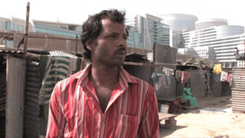 Gurgaon/Indien, 22.06.2009 - Vor den bizarren Neubauten Gurgaons, Symbol des wirtschaftlich prosperierenden Indiens, hausen die Familien der Bauarbeiter in Verschlägen aus Wellblech.