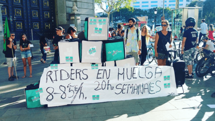 In May 2017 riders at Deliveroo, Glovo and UberEats began to organise in Spain, holding strikes and protests across the country. In Barcelona they created the RidersXDerechos campaign (Riders4Rights) to demands better conditions and basic protections, such as the right to a minimum hourly wage.